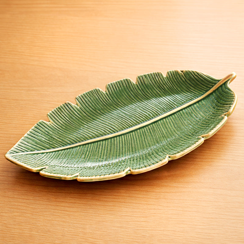 Measuring 29 cm long by 16 cm wide, it’s perfectly sized for displaying jewellery and treasured keepsakes, or for serving small bites such as olives, pâtés, and crackers. Crafted from durable ceramic and beautifully detailed to resemble a banana leaf, it instantly becomes a conversation piece at any dinner table.