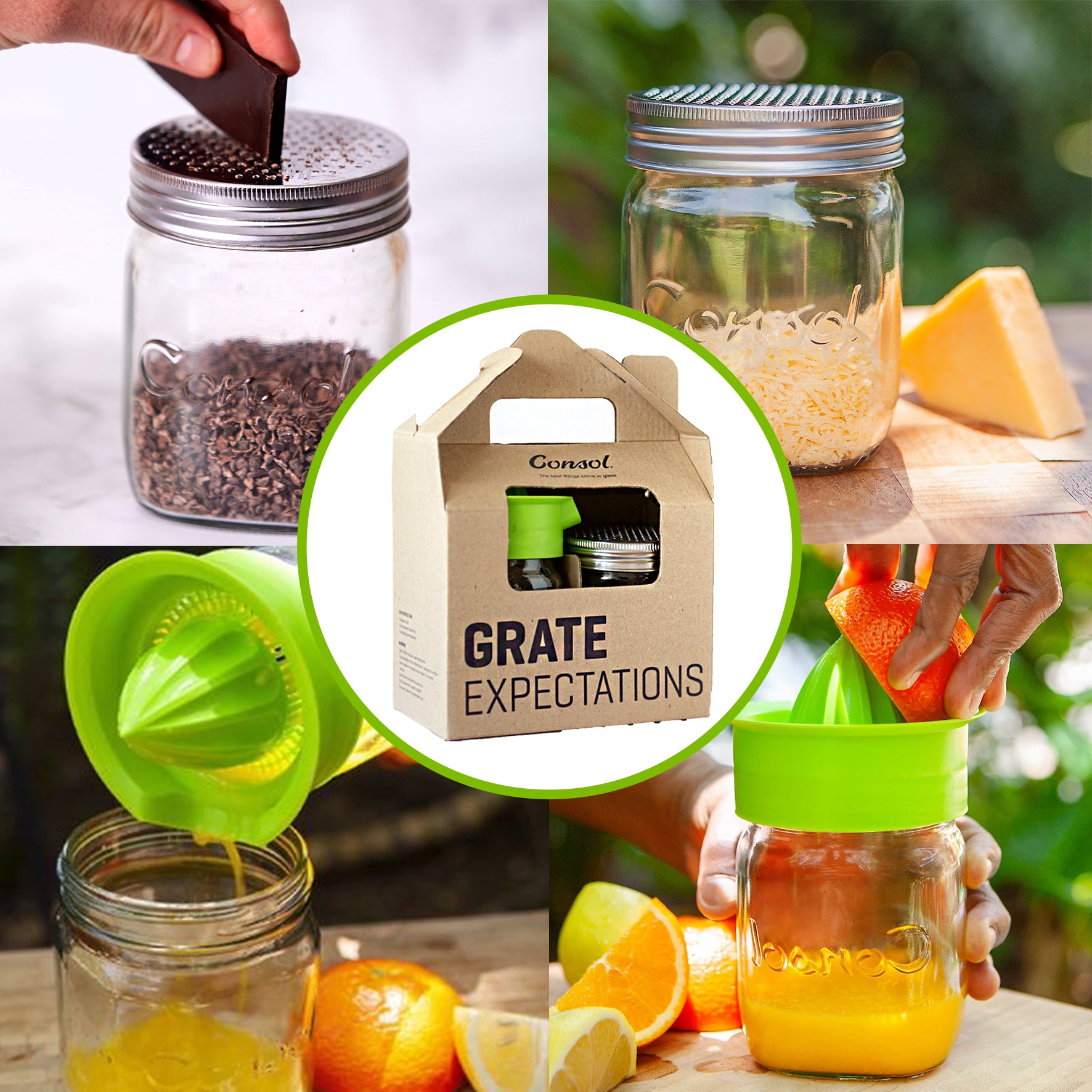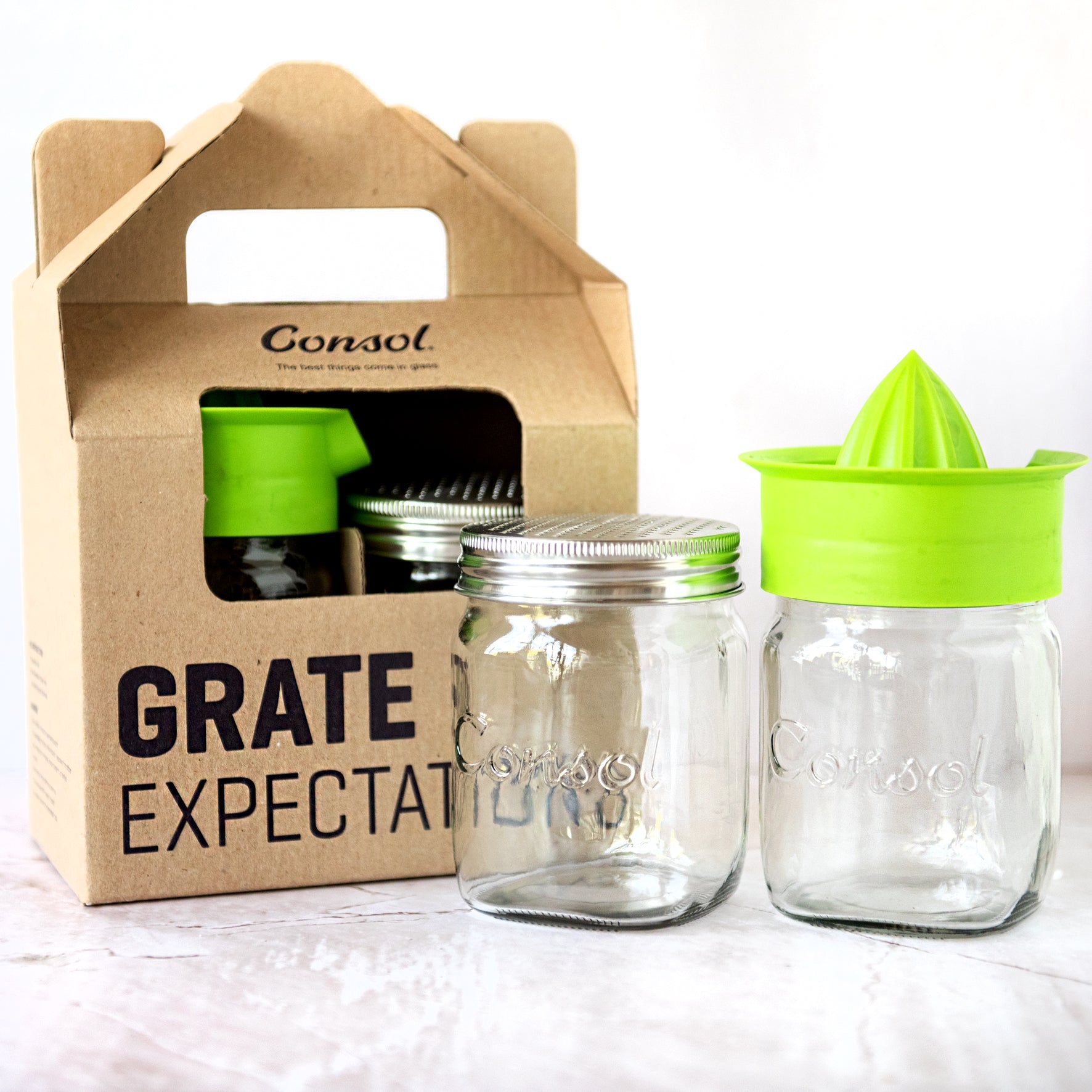 Transform your kitchen routine with this cleverly curated set of two 500ml Consol Glass jars, each topped with a specialized lid designed for real cooking needs. The stainless steel grater lid handles everything from cheese to vegetables with ease, while the juicer lid extracts fresh citrus in seconds. Built to last with genuine Consol glass, these versatile jars move effortlessly from prep station to fridge to table. The witty, charm-filled packaging makes this an unforgettable gift for anyone who values both practicality and personality in their kitchen essentials.