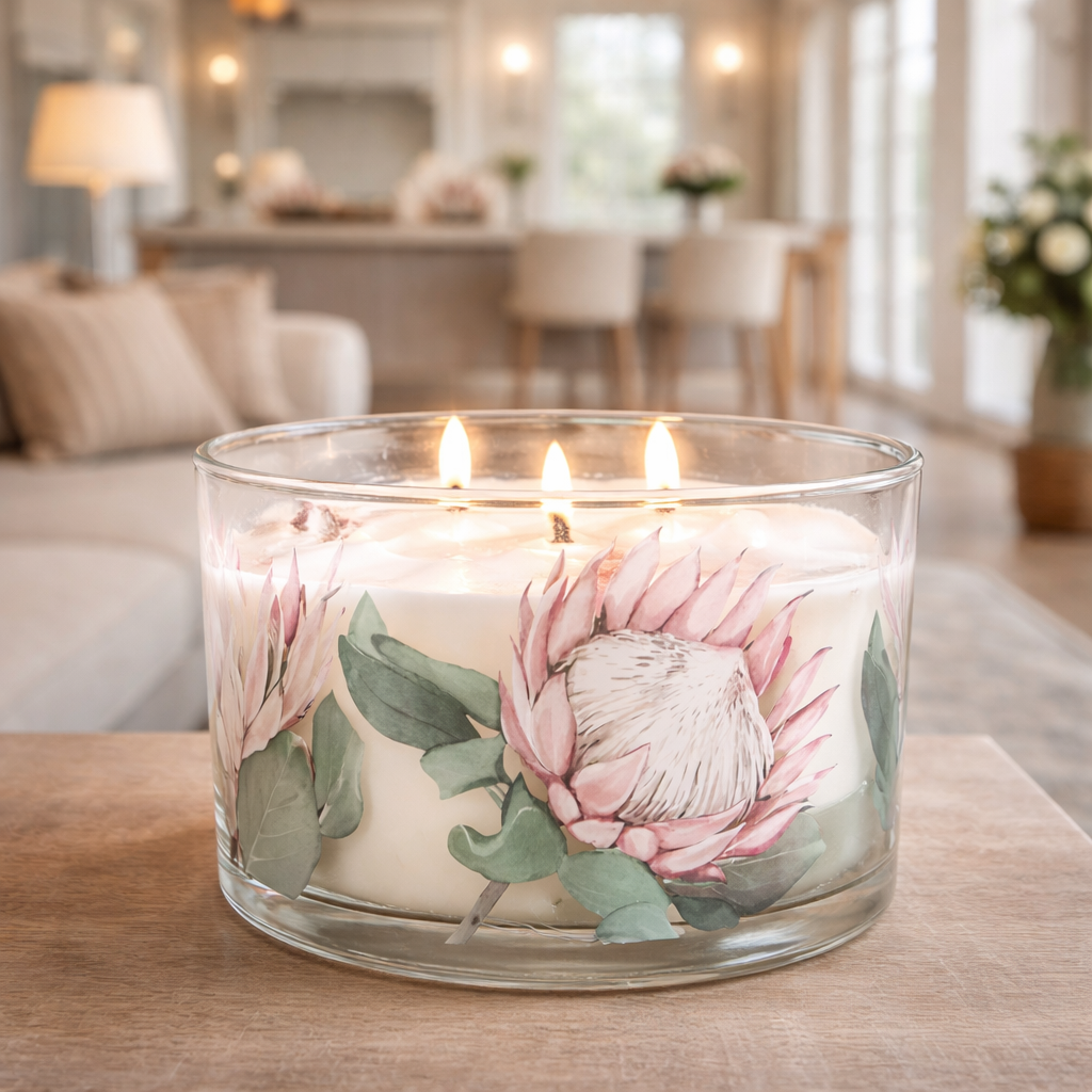 Experience the essence of South African heritage with our Protea Luxury Scented Candle. With three wicks for even burning and a sleek glass container, this candle exudes elegance and a delightful fragrance. Its inspiration comes from the country's national flower, the protea, adding cultural pride to any room. Enjoy a warm, inviting atmosphere in your home with this 400g, triple-wick candle in a 13 x 8cm container.