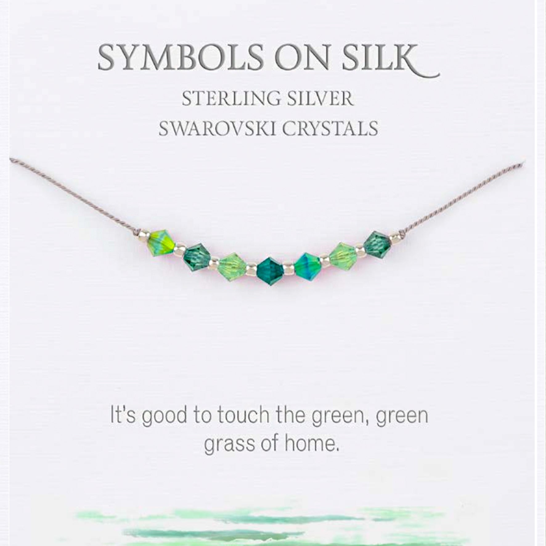 This necklace showcases Swarovski crystals in a variety of shimmering green tones, expertly threaded onto a delicate silk cord.