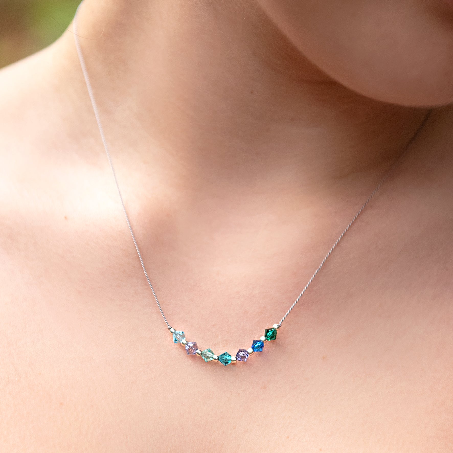 This necklace features Swarovski crystals in multiple blue hues, carefully strung on a fine silk thread.