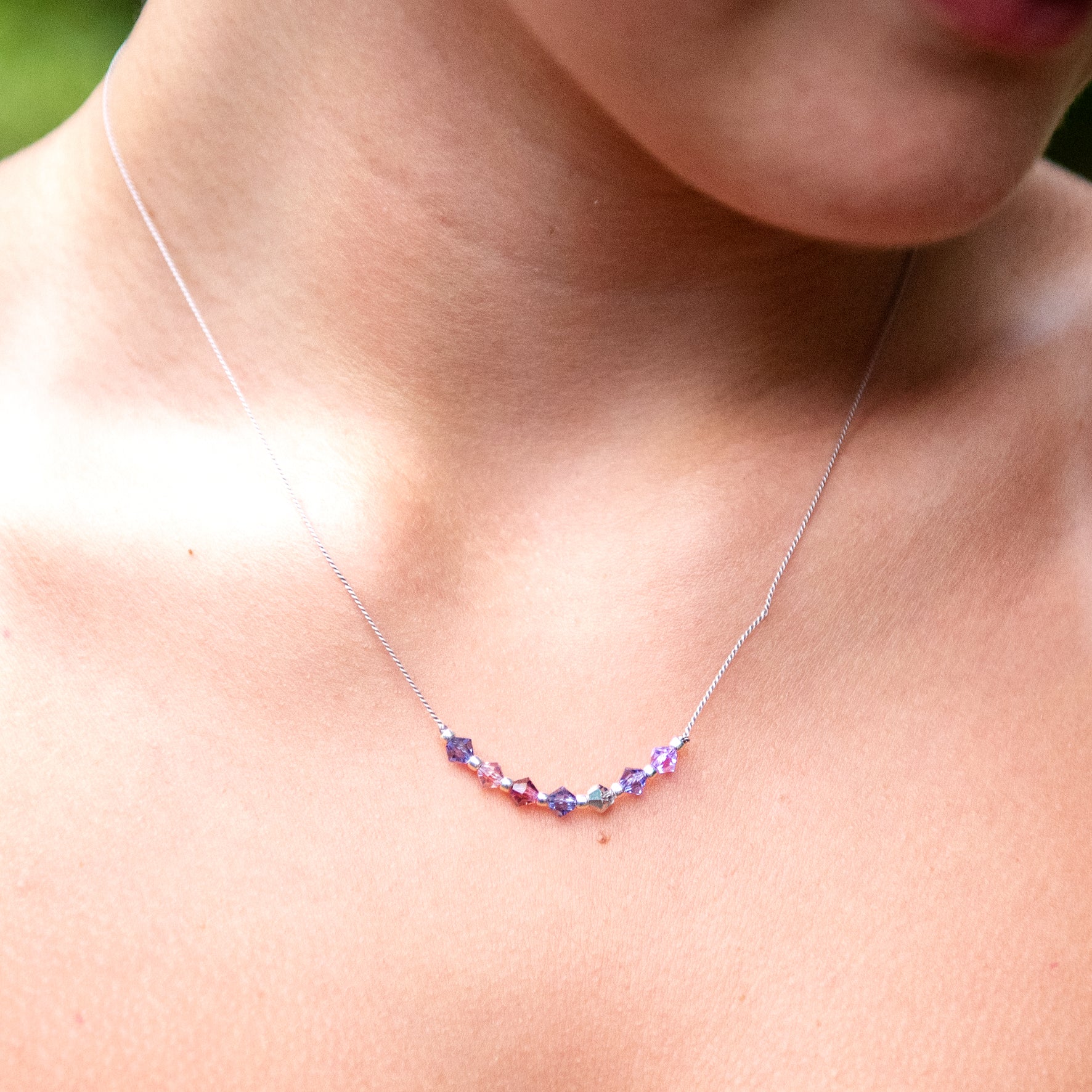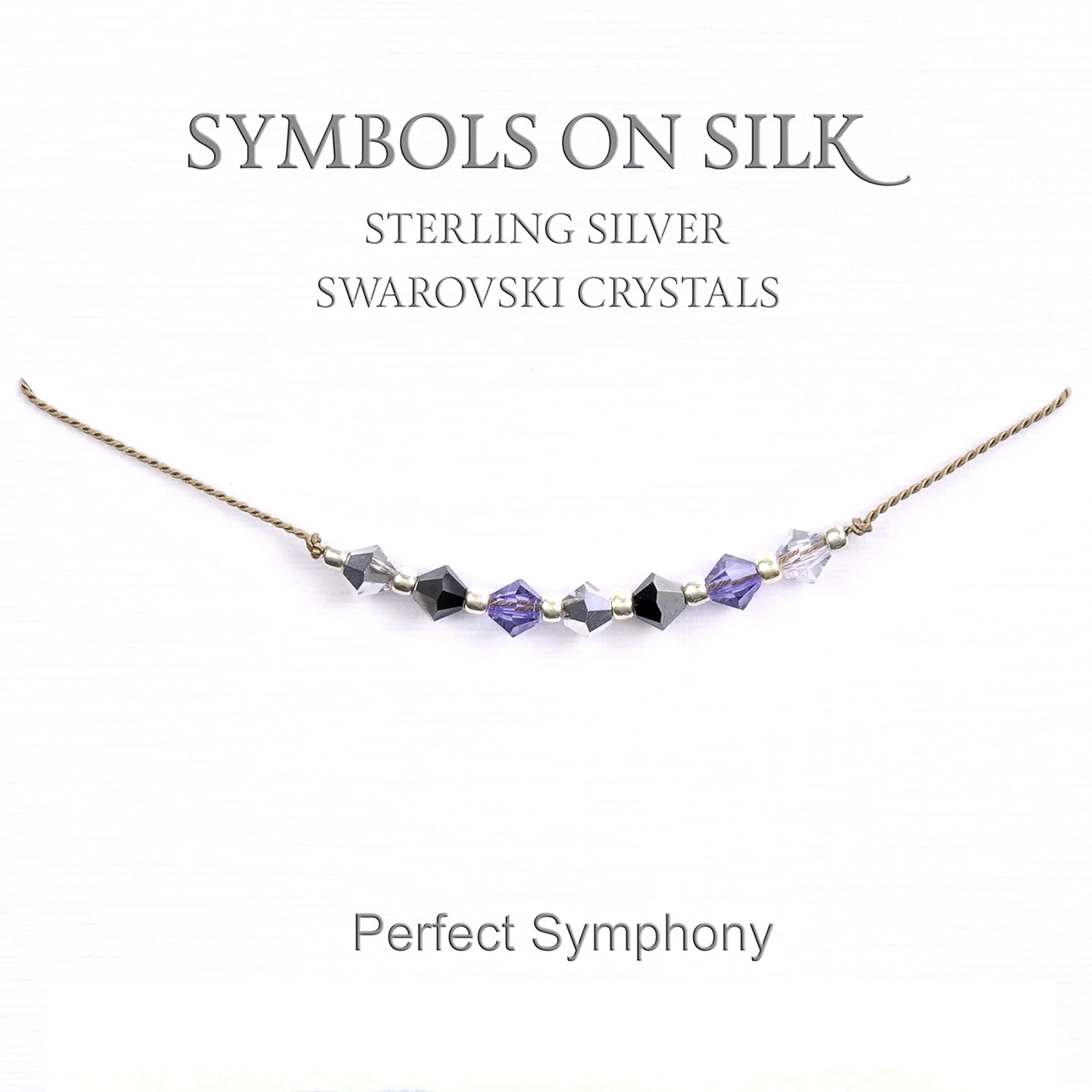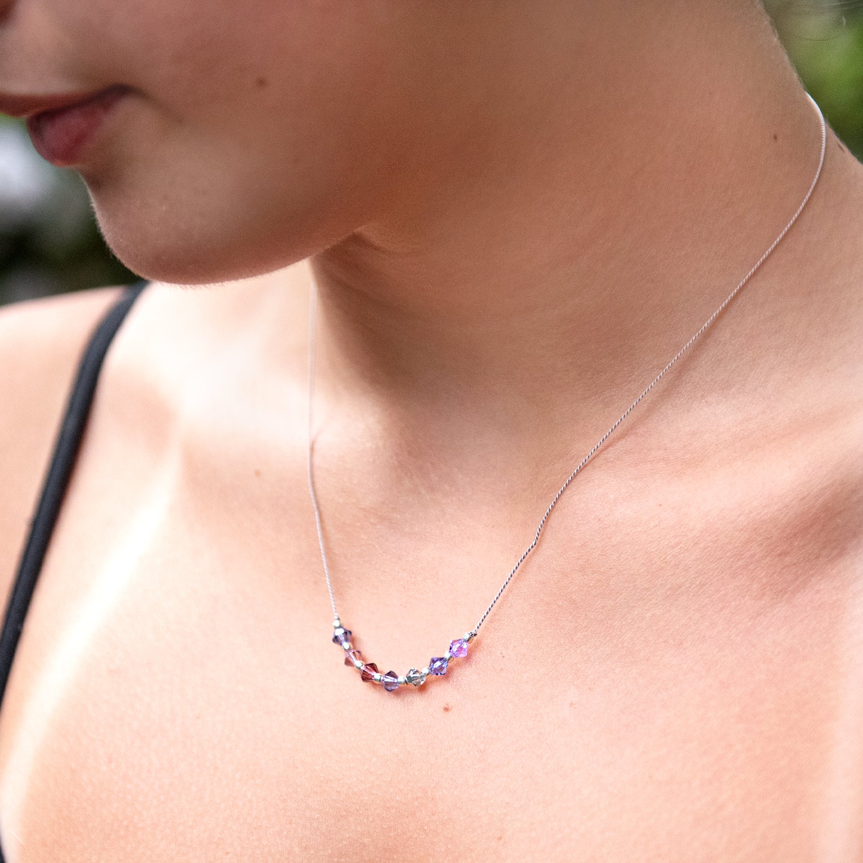This necklace showcases Swarovski crystals in a variety of shimmering Purple tones, expertly threaded onto a delicate silk cord.